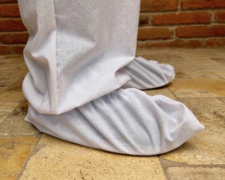 Tela: Antifluido.  Composición: Algodón 35%, Poliéster 65%.  Peso: 123 a 136 gr/m2.  Descripción:  Babuchas en tela antifluido para protección de zapatos.  Elástico en orificio y punta.  Lavadas:  50.