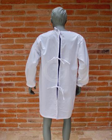 Tela: Antifluido. Composición: Algodón 35%, Poliéster 65%. Peso: 123 a 136 gr/m2. Descripción: Bata de protección manga larga en tela antifluido. Elástico en puños. Tiras de la misma tela en cuello y cintura para cerrar. Lavadas: 50.