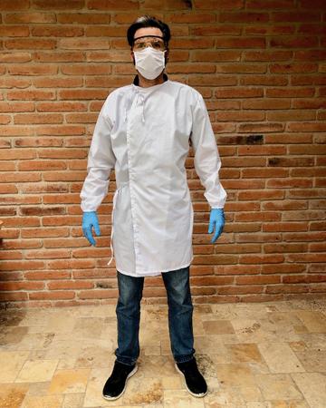 Tela: Antifluido. Composición: Algodón 35%, Poliéster 65%. Peso: 123 a 136 gr/m2. Descripción: Bata de protección manga larga en tela antifluido. Elástico en puños. Tiras de la misma tela en cuello y cintura para cerrar sobrepuesto. Se puede poner con abertura en el frente o en la espalda. Lavadas: 50.